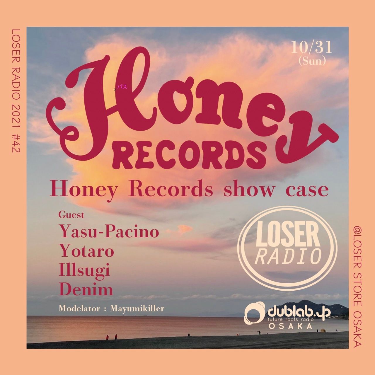 10/31のDUBLAB大阪”LOSER RADIO”#42 会場の難波LOSERはMayumikillerをホストに配信。HONEY RECORDSのショーケース配信をご紹介。HONEY RECORDS主宰YASU-PACHINOによるdjセット、Denim、IllSUGI、Yotaroによるライブセットと盛り沢山の配信でした。