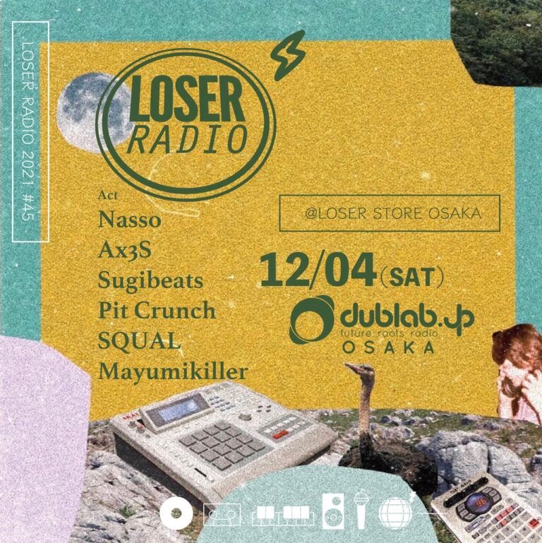 12/4のDUBLAB大阪”LOSER RADIO”#45 会場の難波LOSERは、Mayumikillerをホストに配信。ゲストにAx3S 、SQUAL、pit crunch、NASSO、 SUGIBEATSのライブご紹介。キュレーターMayumikillerや出演者によるトークも有りの配信でした。